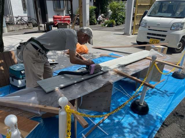 ほこりがでないよう養生をひき集塵機付きの丸鋸で作業をしています。
